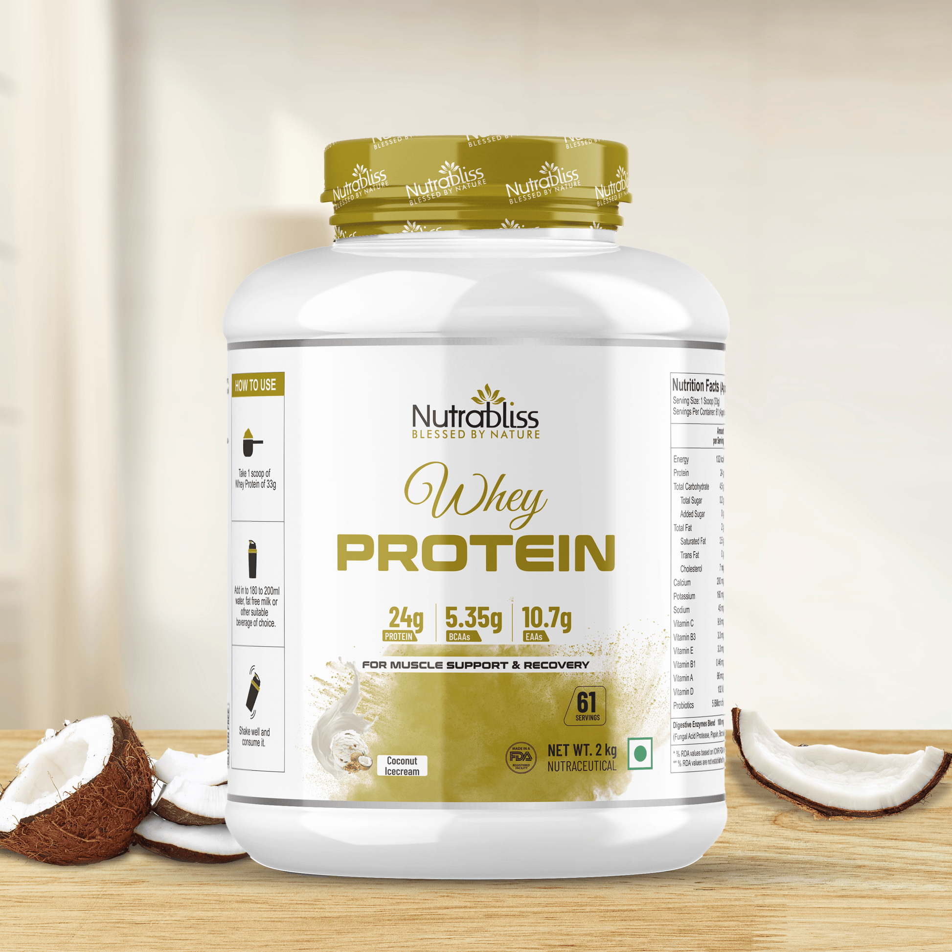 • Nutrabliss Whey Protein offers a premium blend of Whey Protein Concentrate enriched with digestive enzymes and probiotics. Each 33g serving delivers 24g of pure protein, formulated for optimal muscle recovery and growth.